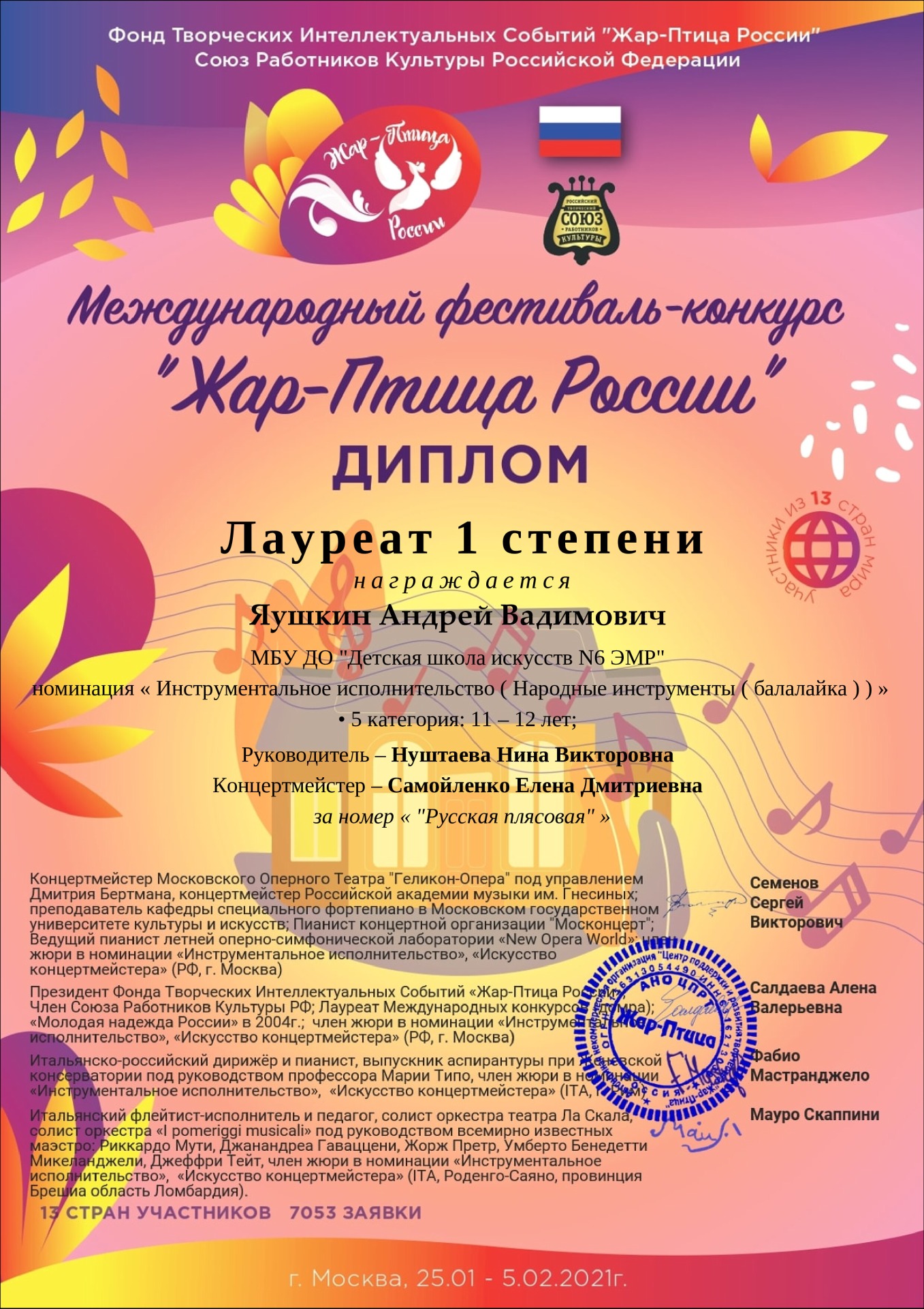 Поздравляем Яушкина Андрея - лауреата I степени Международного фестиваля-конкурса «Жар-Птица России»