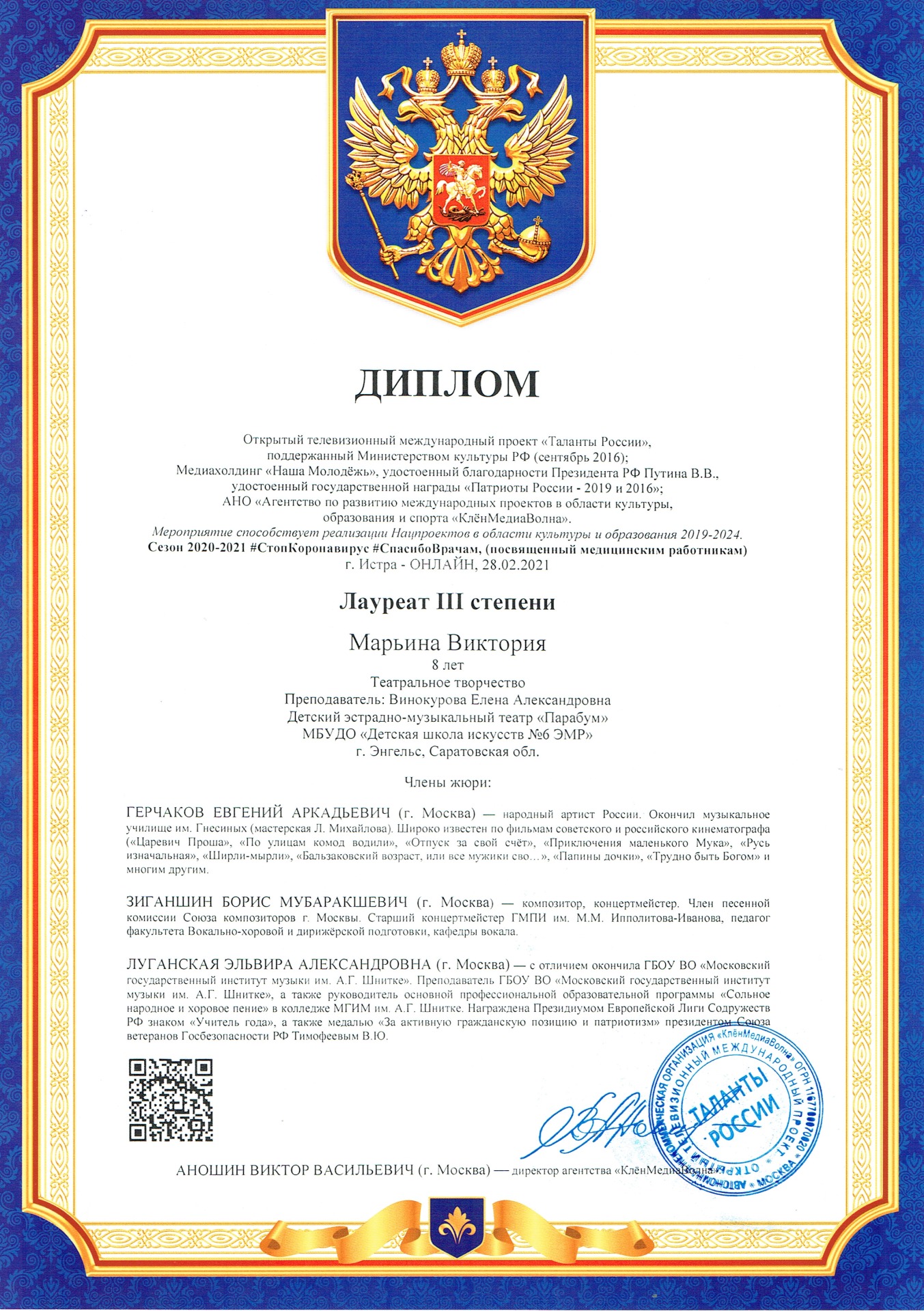 Поздравляем Викторию Марьину - лауреата III степени телевизионного международного проекта «Таланты России» (г. Истра)