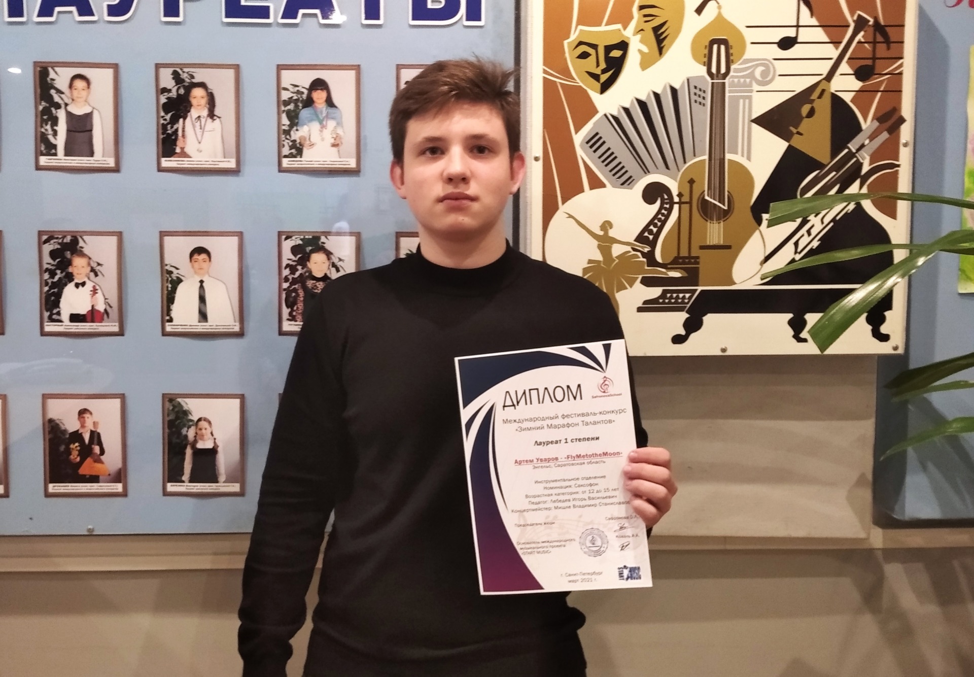 В начале марта в г. Санкт-Петербург были подведены итоги Международного фестиваля-конкурса «Зимний Марафон Талантов». Фестиваль-конкурс проходил в  дистанционном формате по нескольким номинациям: вокал, хореография, театральное творчество, инструментальное творчество. Учащиеся класса преподавателя Лебедева Игоря Васильевича Уваров Артем и Пономарева Софья приняли участие в фестивале-конкурсе и добились высоких результатов. В возрастной категории «7-11 лет»  Пономарева Софья стала лауреатом 1 степени. Уваров Артем тоже стал лауреатом 1 степени, но в возрастной категории  «12-15 лет». Поздравляем Артема и Софью с высокими результатами!