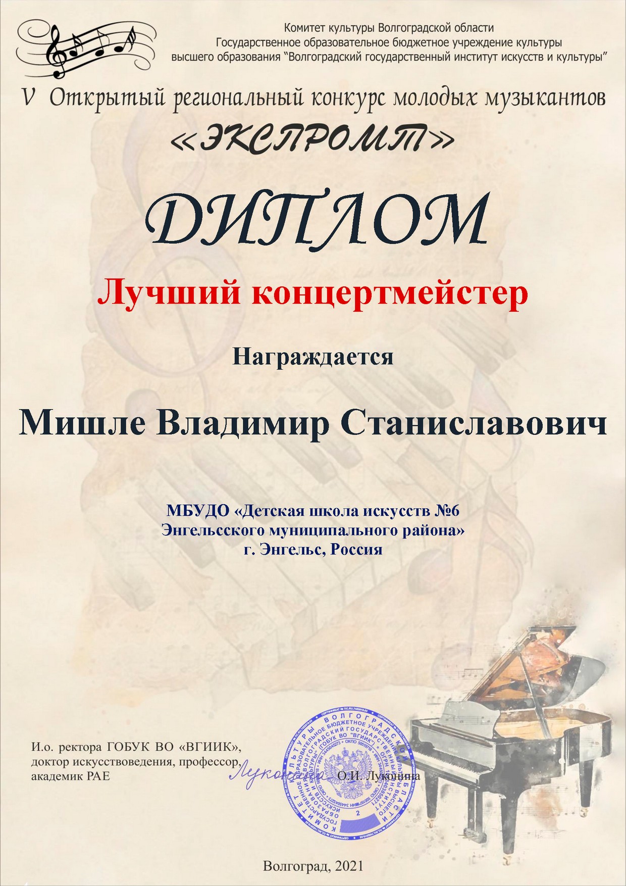 Кроме того, концертмейстер Мишле Владимир Станиславович решением жюри получил диплом «Лучший концертмейстер». Поздравляем учащихся, преподавателей и концертмейстеров с высокими результатами в конкурсе!