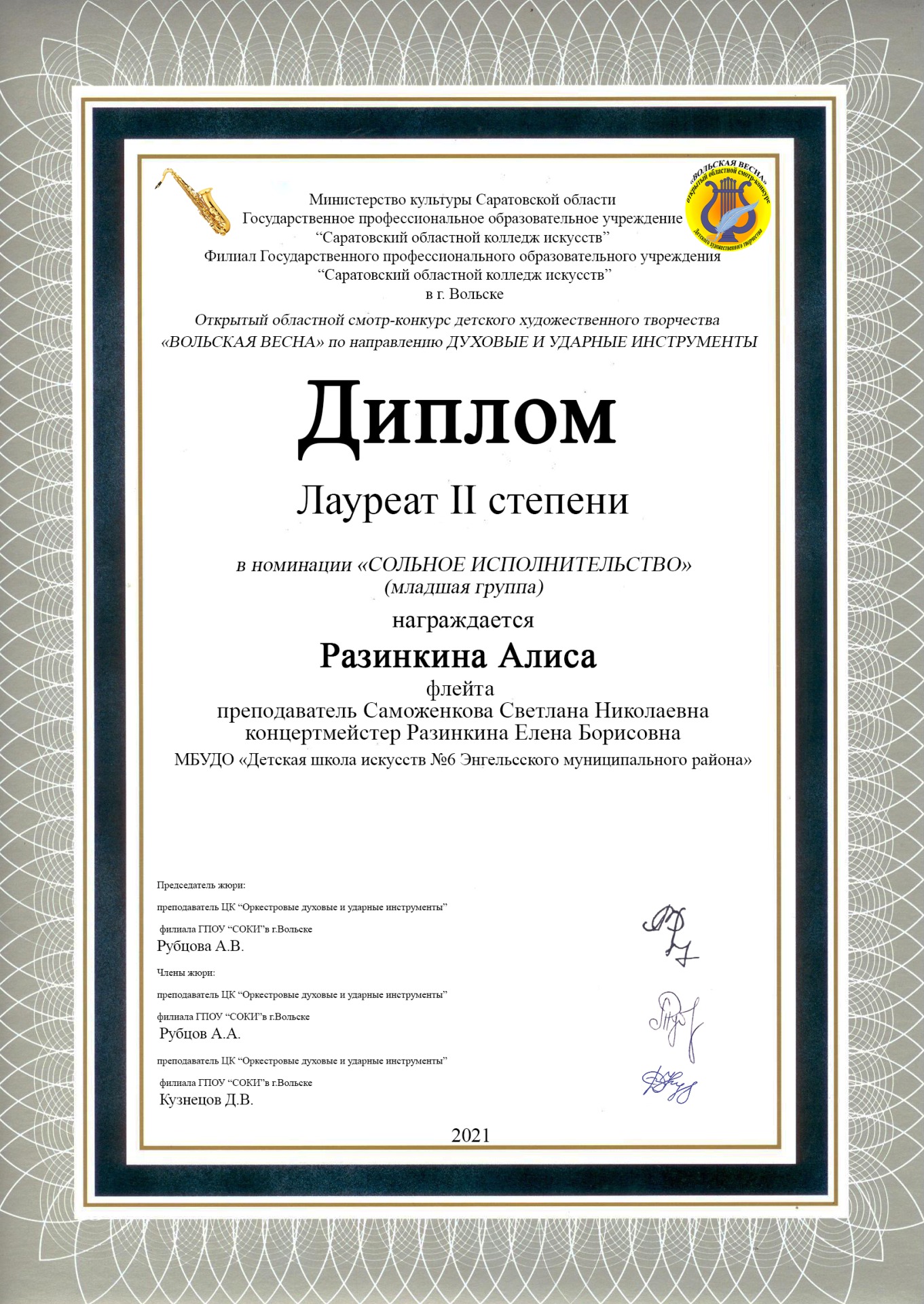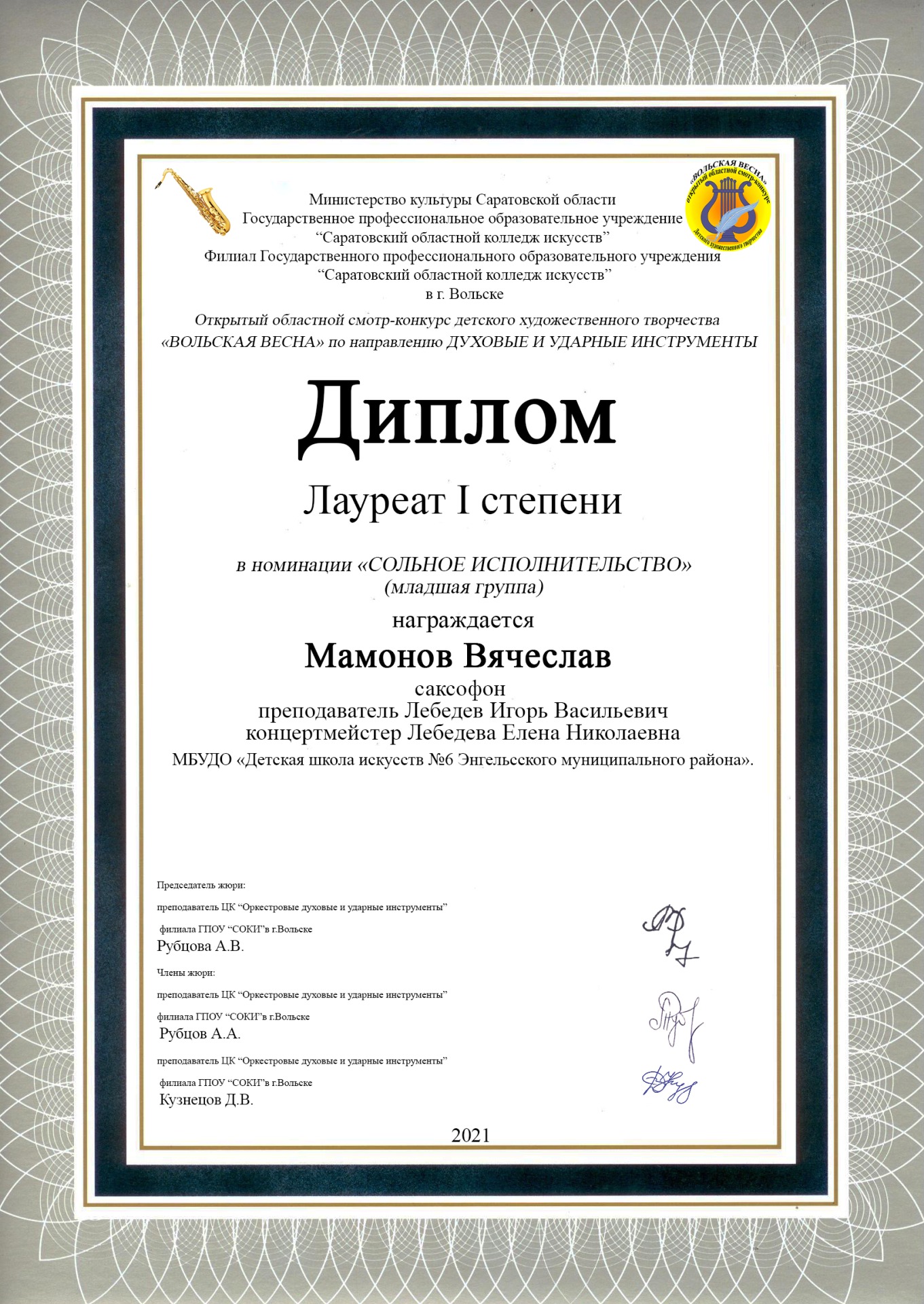 ?Мамонов Вячеслав (саксофон, преп. Лебедев И.В., конц. Лебедева Е.Н.) – лауреат 1 степени;
