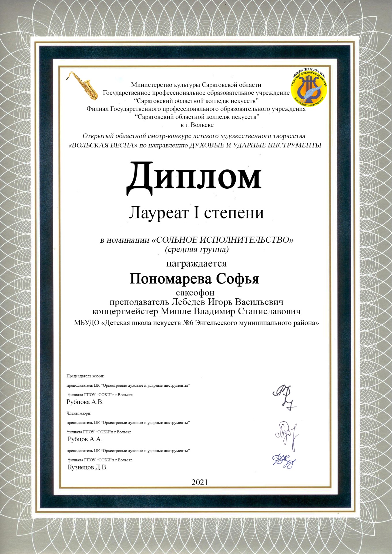 ?Пономарева Софья (саксофон, преп. Лебедев И.В., конц. Мишле В.С.) – лауреат 1 степени;