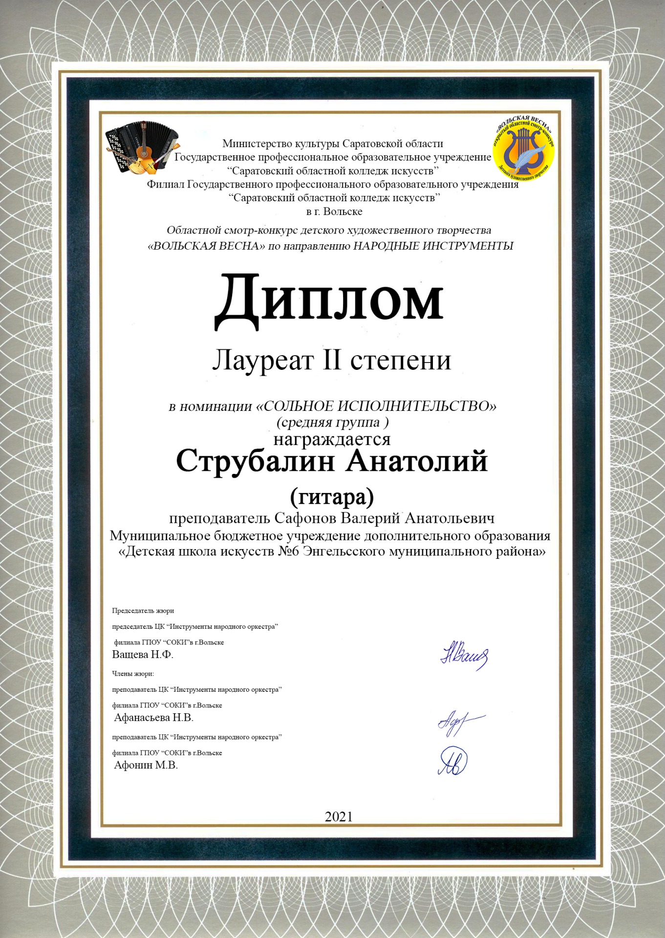 ?Струбалин Анатолий (гитара, преп. Сафонов В.А.) – лауреат 2 степени;