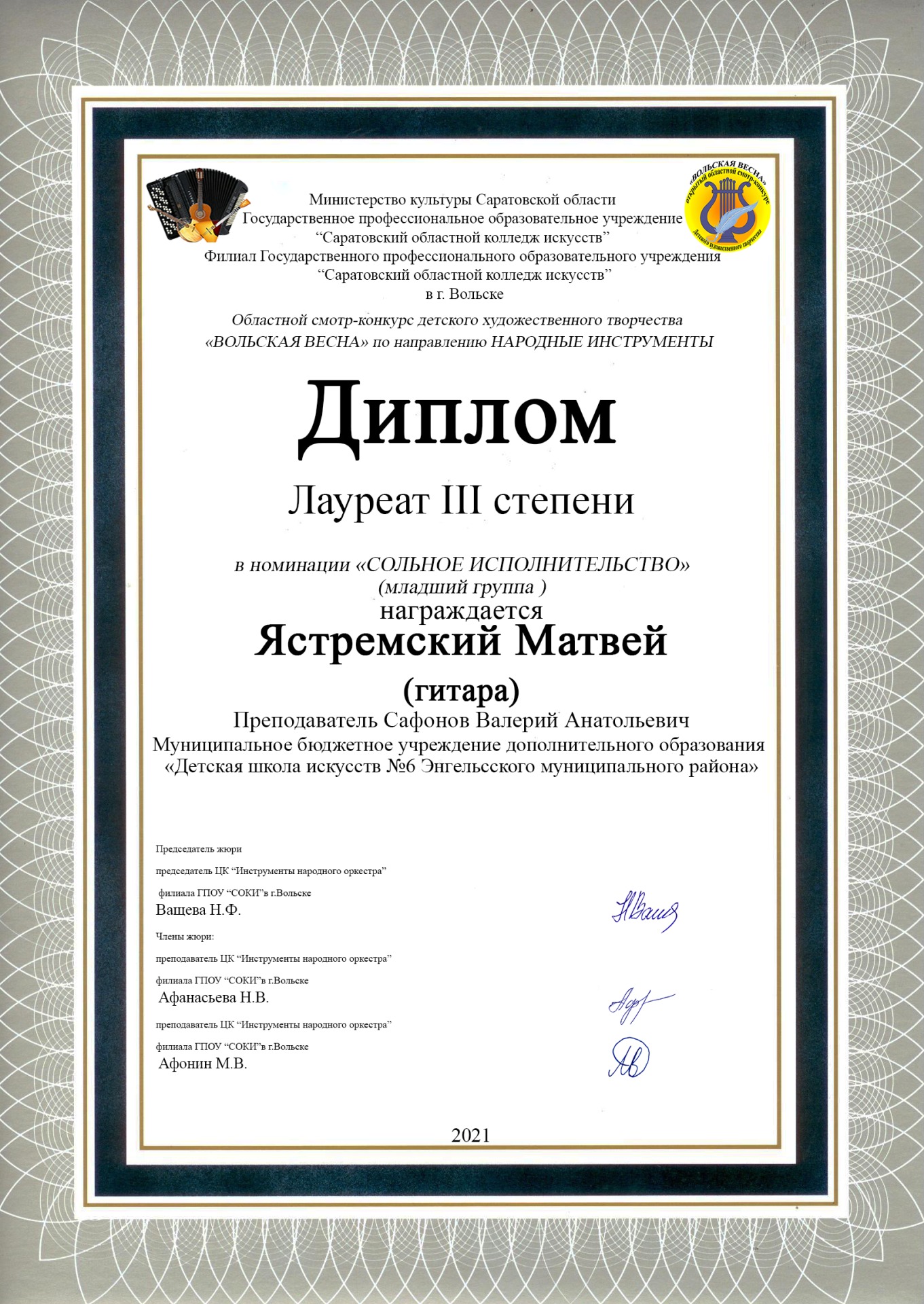 ? Ястремкий Матвей (гитара, преп. Сафонов В.А.) – лауреат 3 степени;