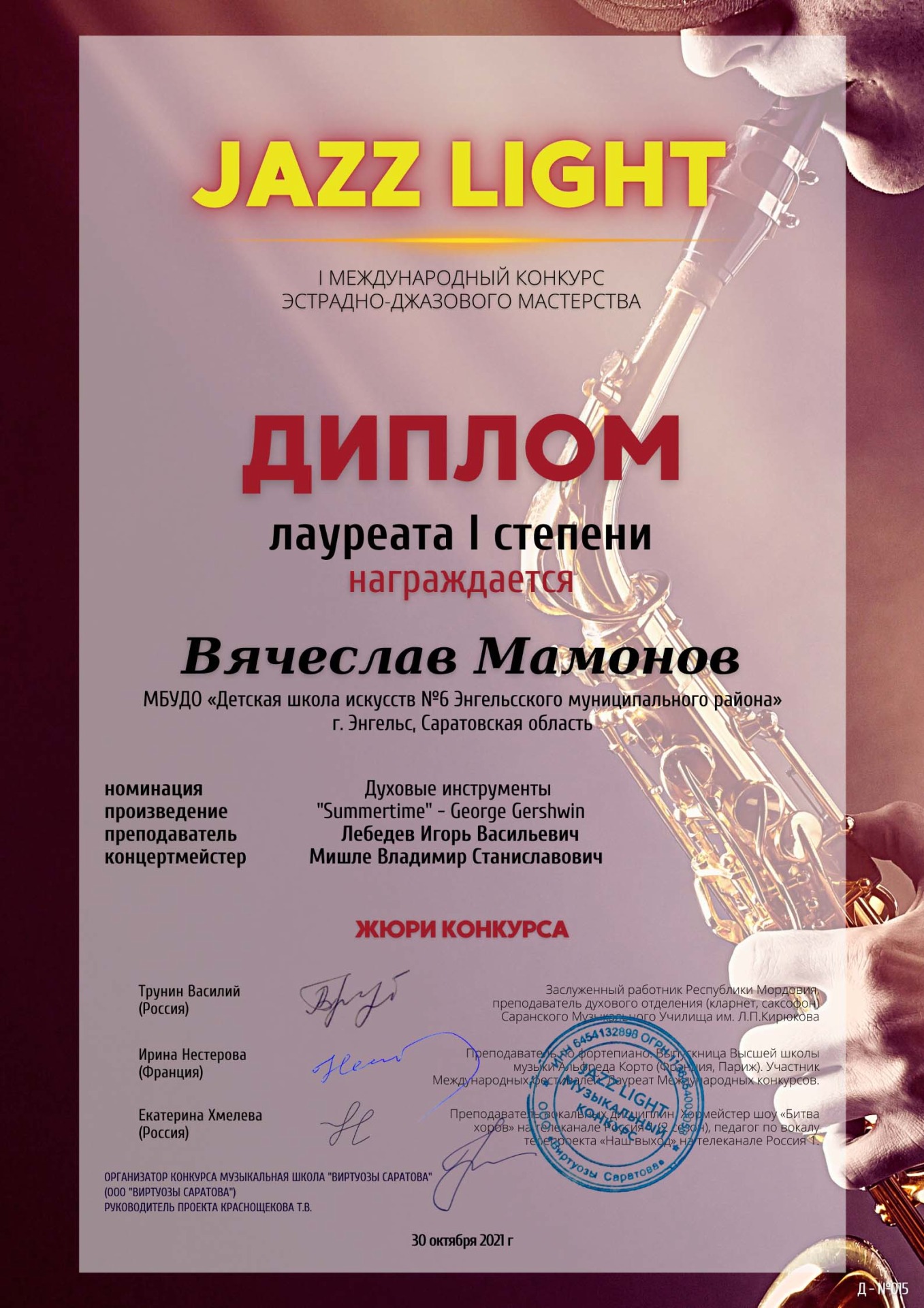 ? Еще одну премию Гран-при в копилку школьных наград принесла Софья Пономарева. На I Международном конкурсе эстрадно-джазового мастерства «Jazz light» именно так жюри оценило ее выступление. Также в данном конкурсе принял участие Вячеслав Мамонов, который по оценкам членов жюри стал лауреатом I степени! Подготовил учащихся преподаватель Игорь Васильевич Лебедев. Концертмейстер Владимир Станиславович Мишле! Поздравляем участников конкурса и преподавателя с победой!