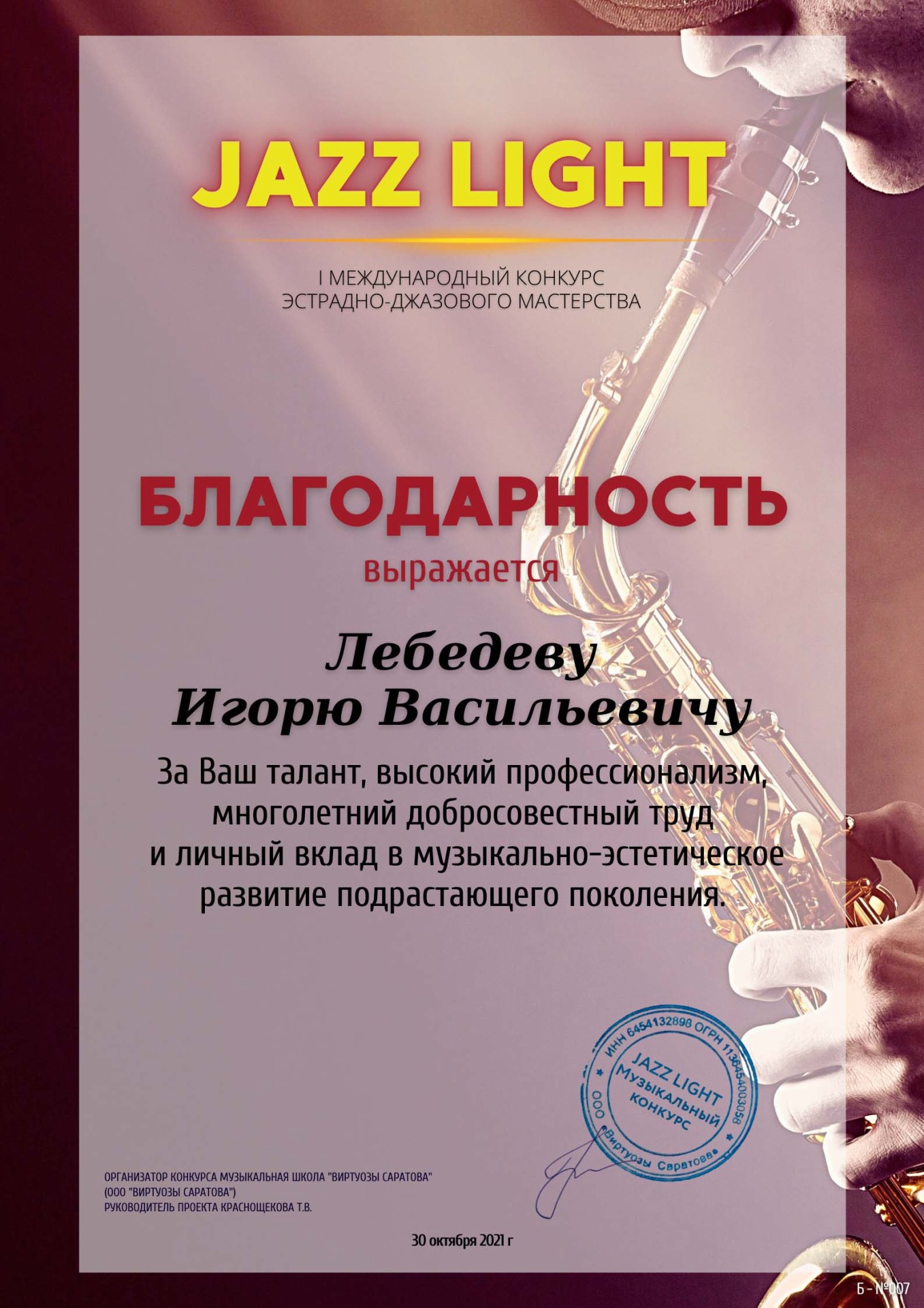 Победа на I Международном конкурсе эстрадно-джазового мастерства «Jazz light»