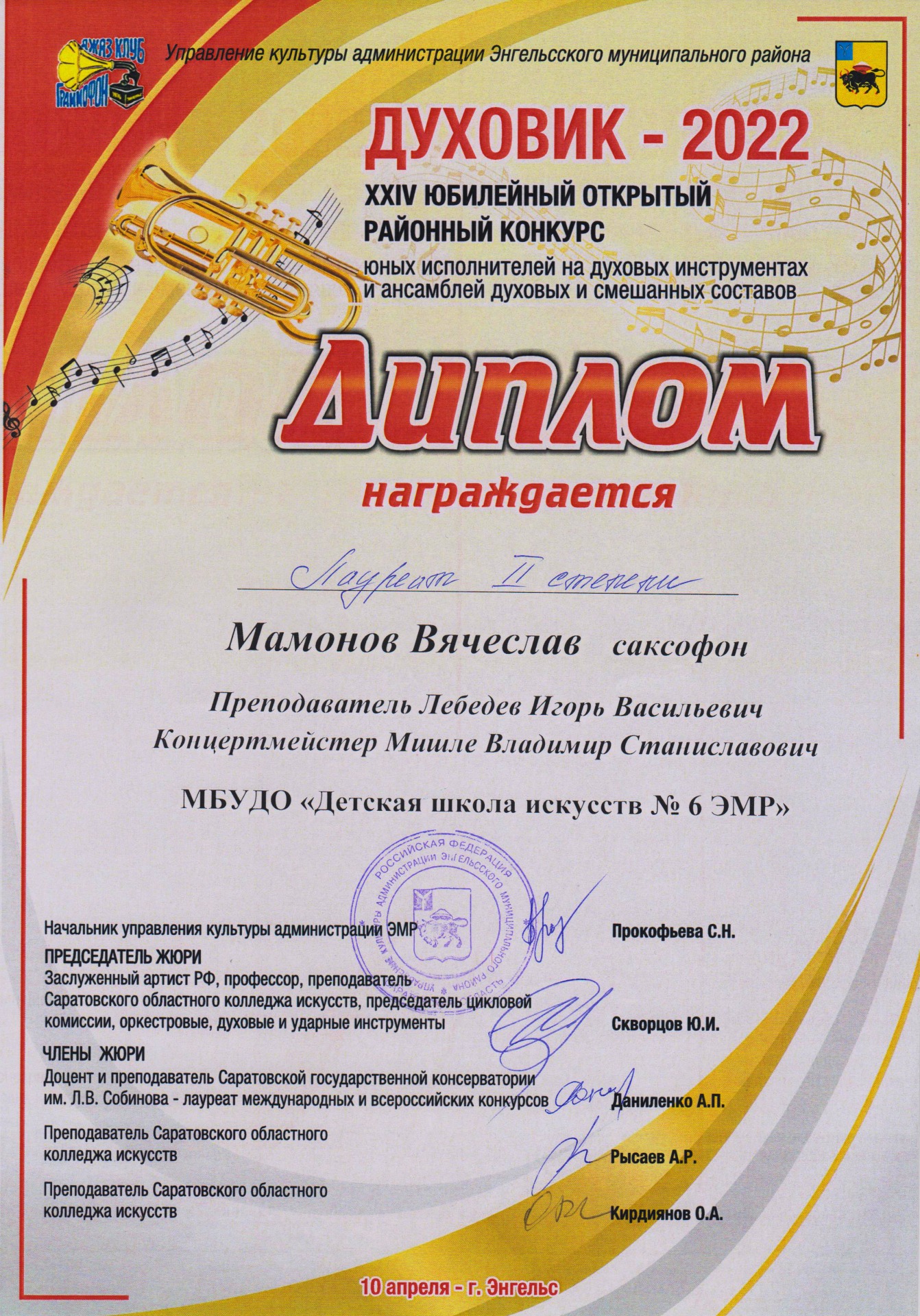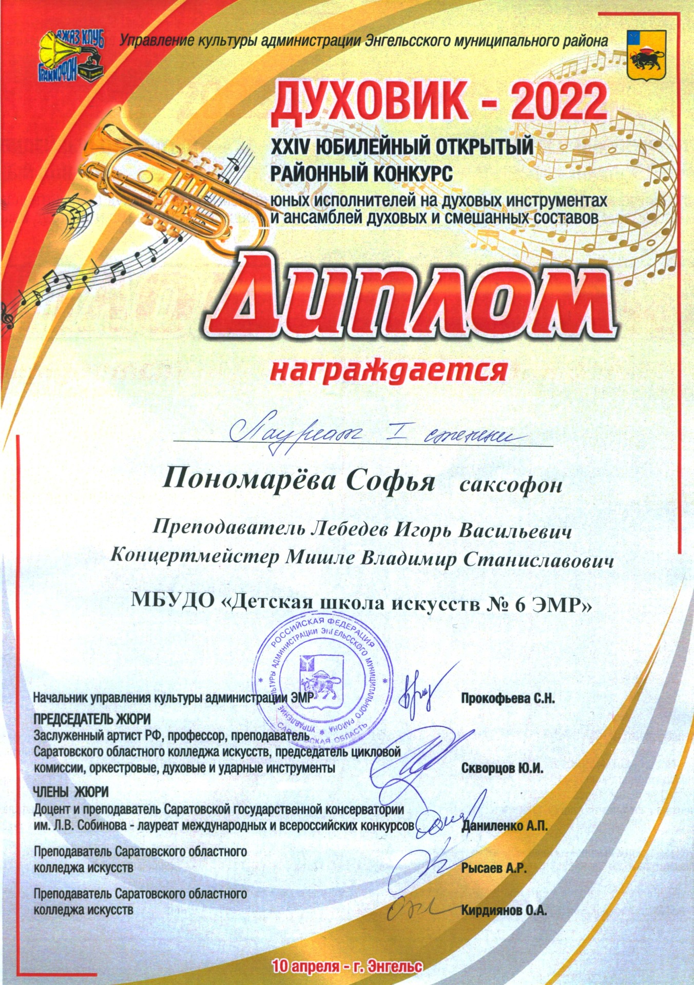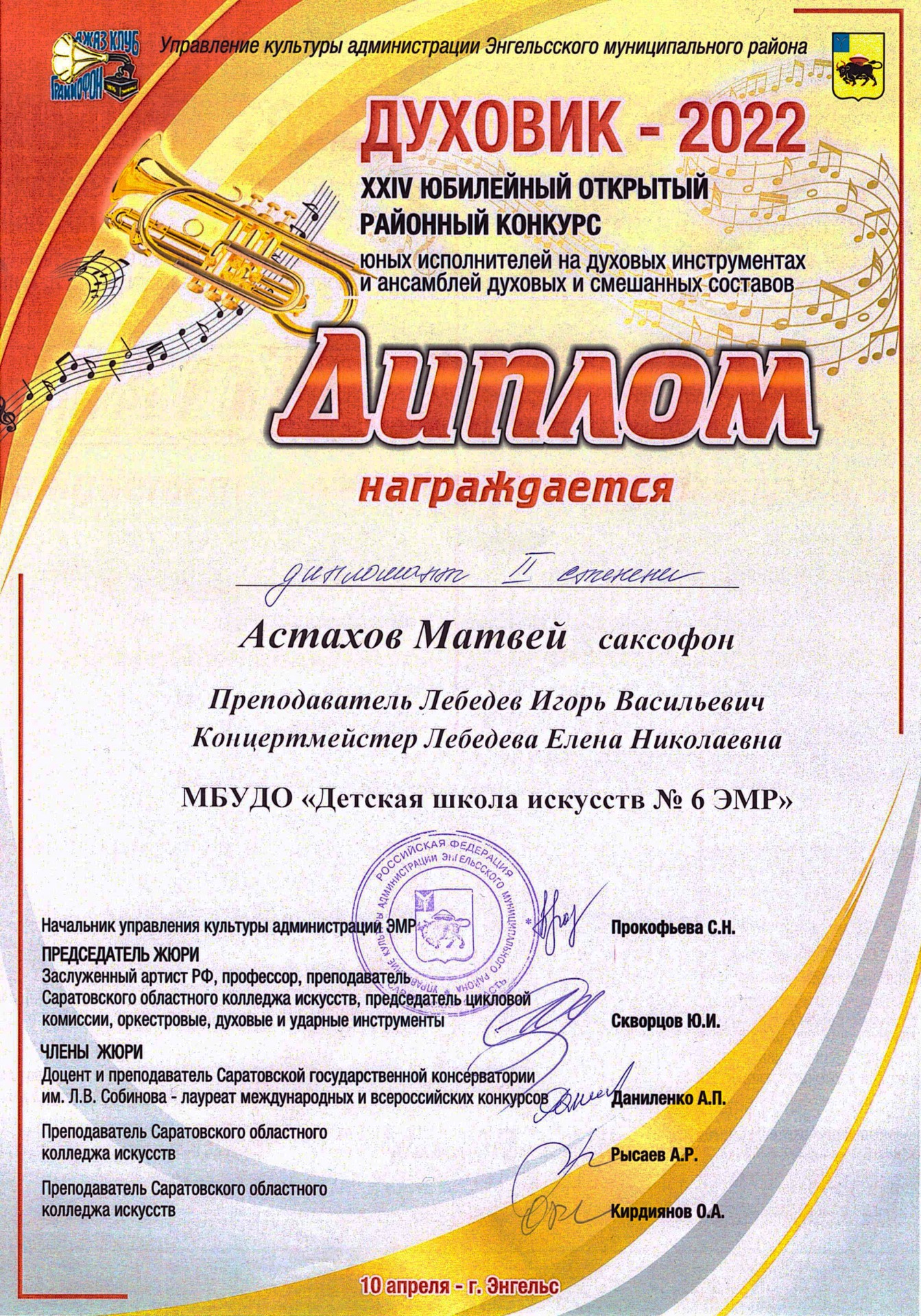 9 и 10 апреля 2022 года в детской школе искусств №1 им. П.А. Фролова проходил XXVI Открытый районный конкурс молодых исполнителей на духовых инструментах «Духовик – 2022». В нем приняли участие четверо учащихся детской школы искусств №6. По результатам прослушиваний, наши воспитанники стали лауреатами и дипломантами конкурса: