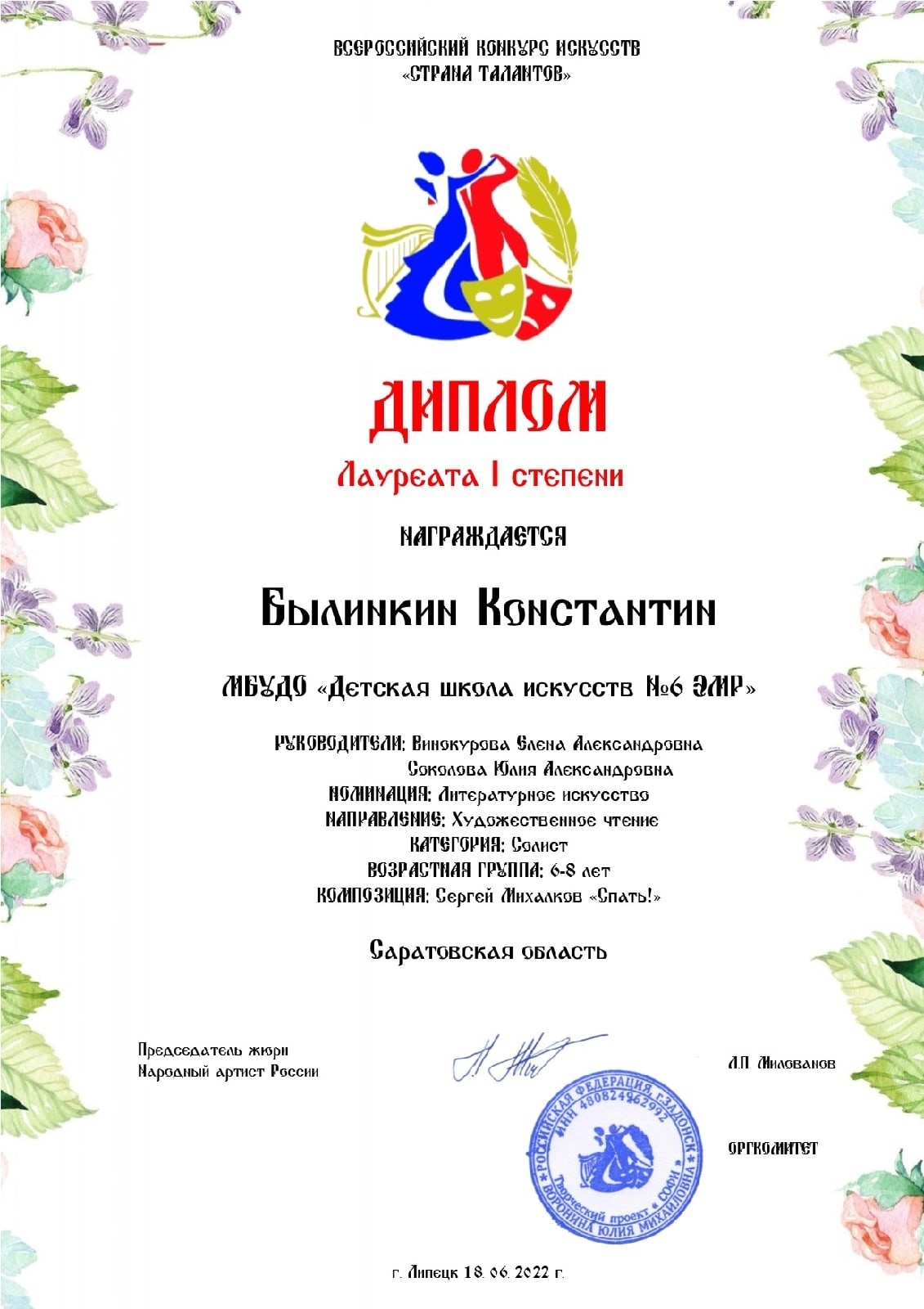 - Константин Былинкин (преп. Винокурова Е.А., Соколова Ю.А.) – диплом лауреата I степени;