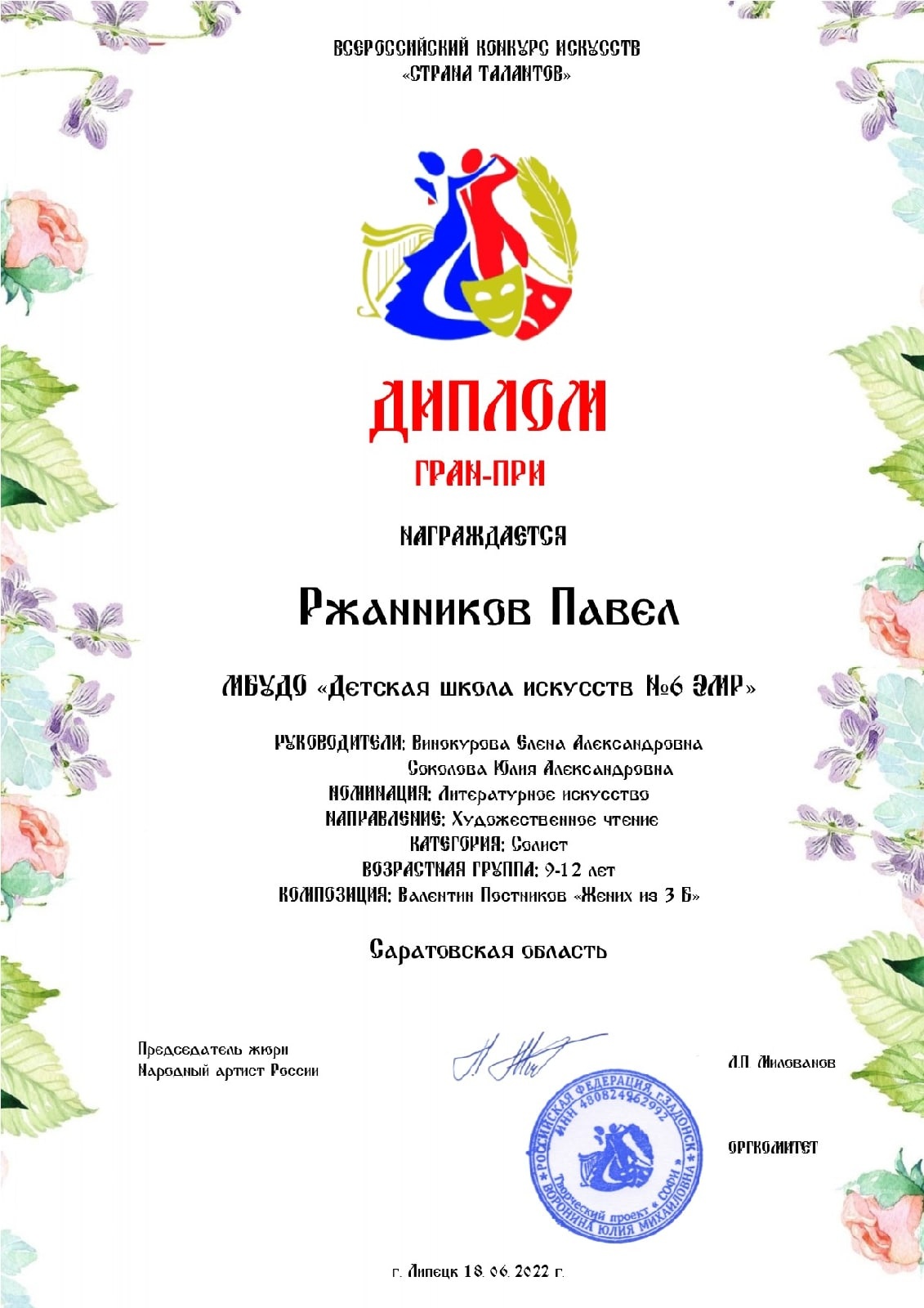 - Павел Ржанников (преп. Винокурова Е.А., Соколова Ю.А.) – диплом Гран-при;