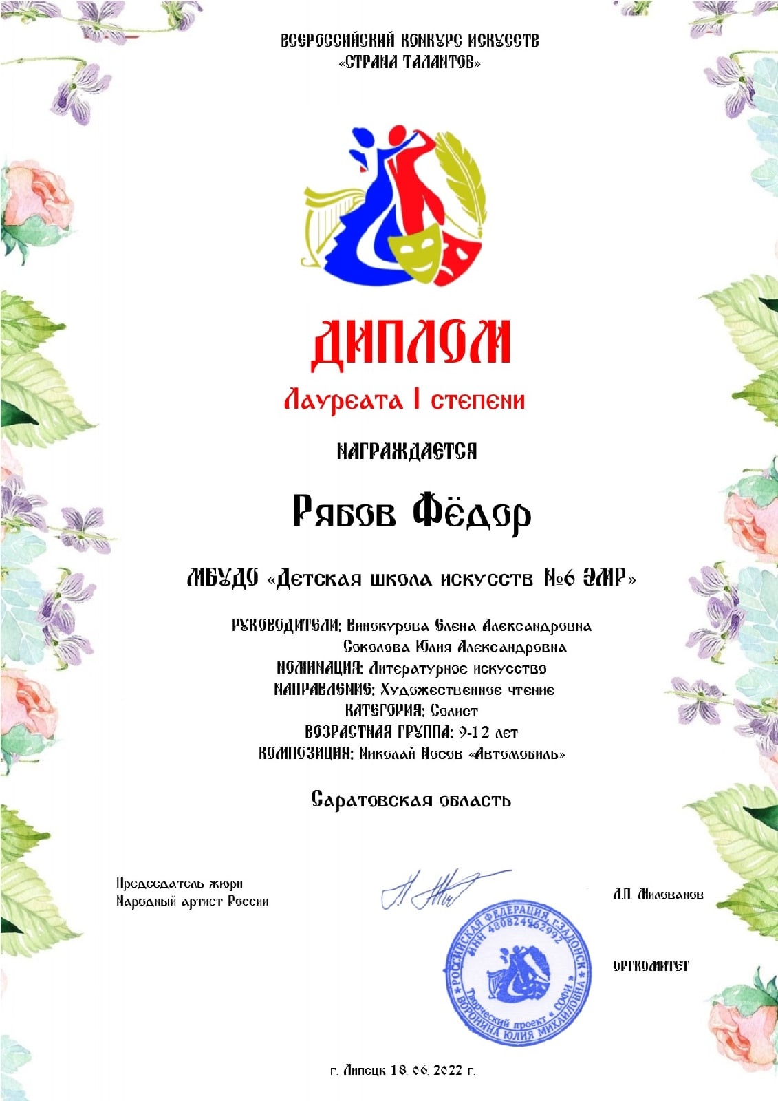 - Федор Рябов (преп. Винокурова Е.А., Соколова Ю.А.) – диплом лауреата I степени;