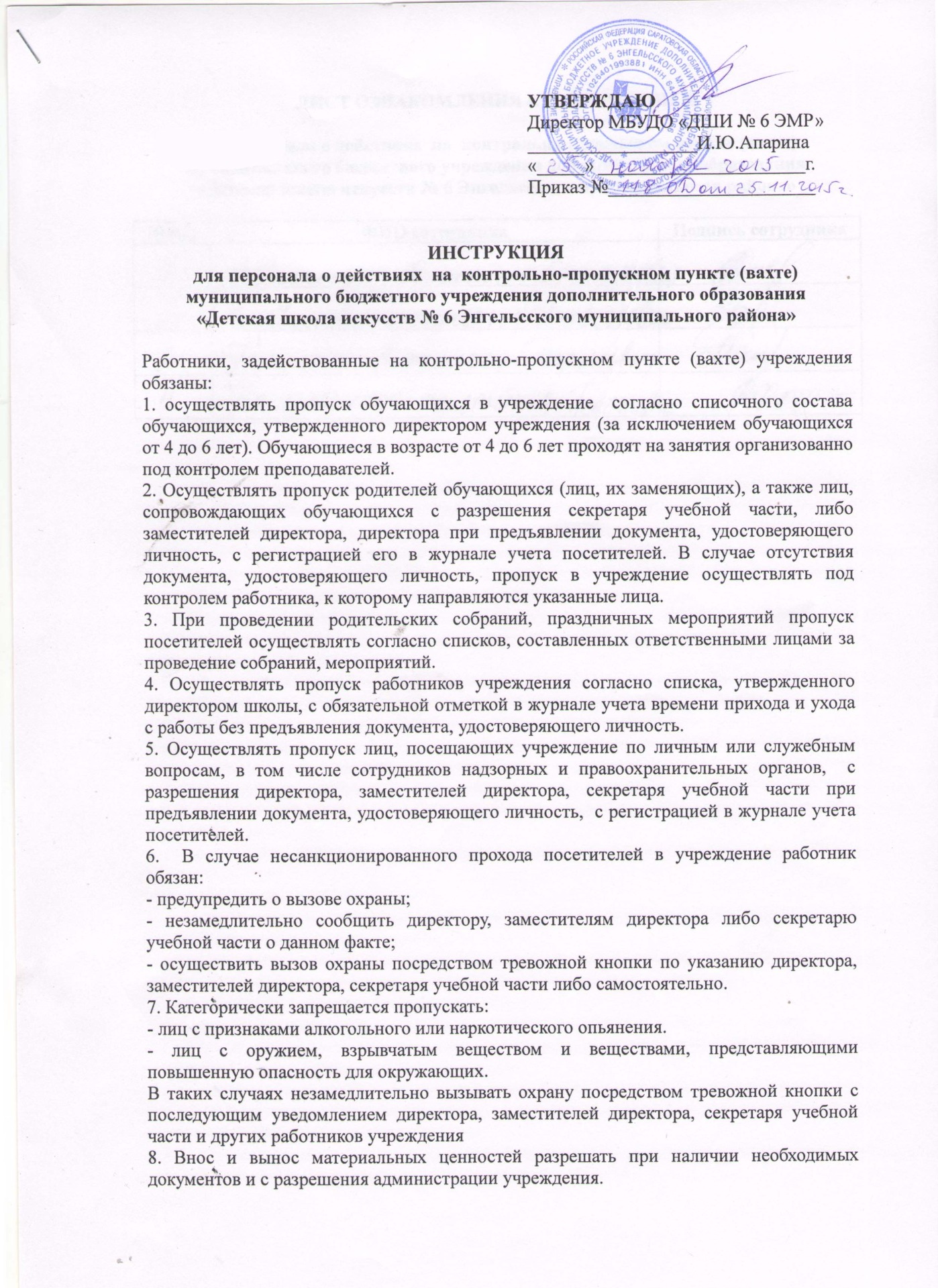ИНСТРУКЦИЯ для персонала о действиях на контрольно-пропускном пункте (вахте) мБУДО «ДШИ № 6 ЭМР»