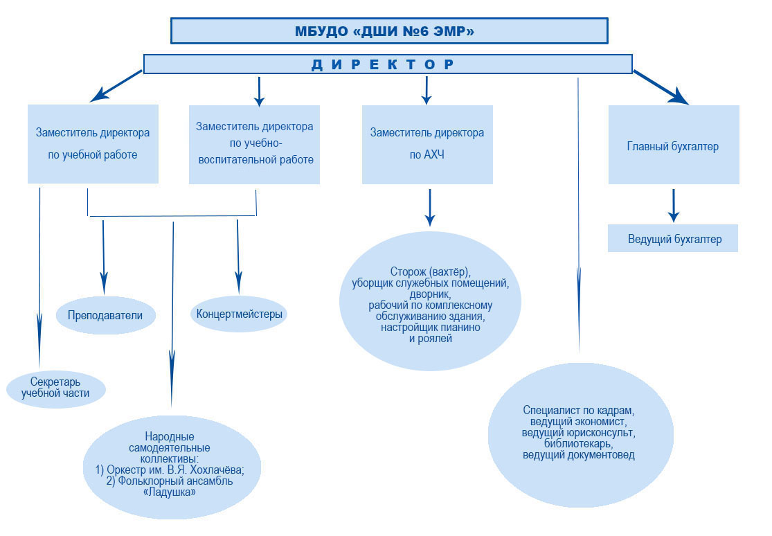 Управление МБУДО «ДШИ № 6 ЭМР» осуществляется в соответствии с законодательством Российской Федерации, Уставом и строится на основе сочетания принципов единоначалия и коллегиальности. Непосредственное управление МБУДО «ДШИ № 6 ЭМР» осуществляет директор. Организацию, управление и контроль качества образовательной деятельности в МБУДО «ДШИ № 6 ЭМР» осуществляют Совет школы, Педагогический совет, Методический совет, Совет родителей, Общее собрание работников. Разграничение полномочий этих органов управления отражены в соответствующих положениях. Все перечисленные структуры совместными усилиями решают основные задачи образовательного учреждения и соответствуют Уставу школы.
